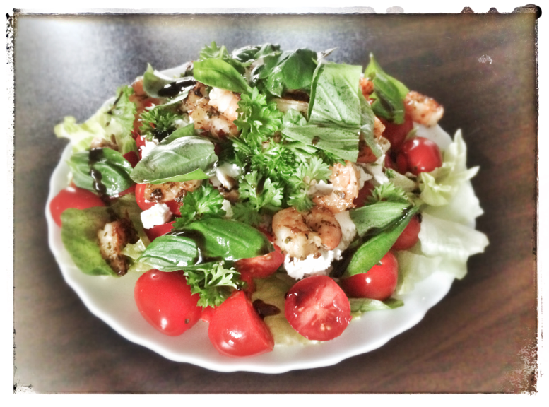 Blattsalat, eine Hand voll Cocktailtomaten, eine rote Paprika, 75 g Schafskäse (leicht/light), 100 g Garnelen (in der Pfanne scharf anbraten mit Salz, Pfeffer, Chili), viele Kräuter (z.B. Schnittlauch, Petersilie, Basilikum), Balsamico-Essig, Olivenöl.