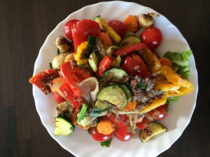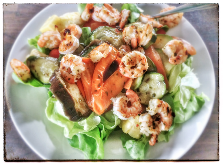 Salat mit gegrilltem Gemüse und Garnelen – low carb und daher prima für den Abend