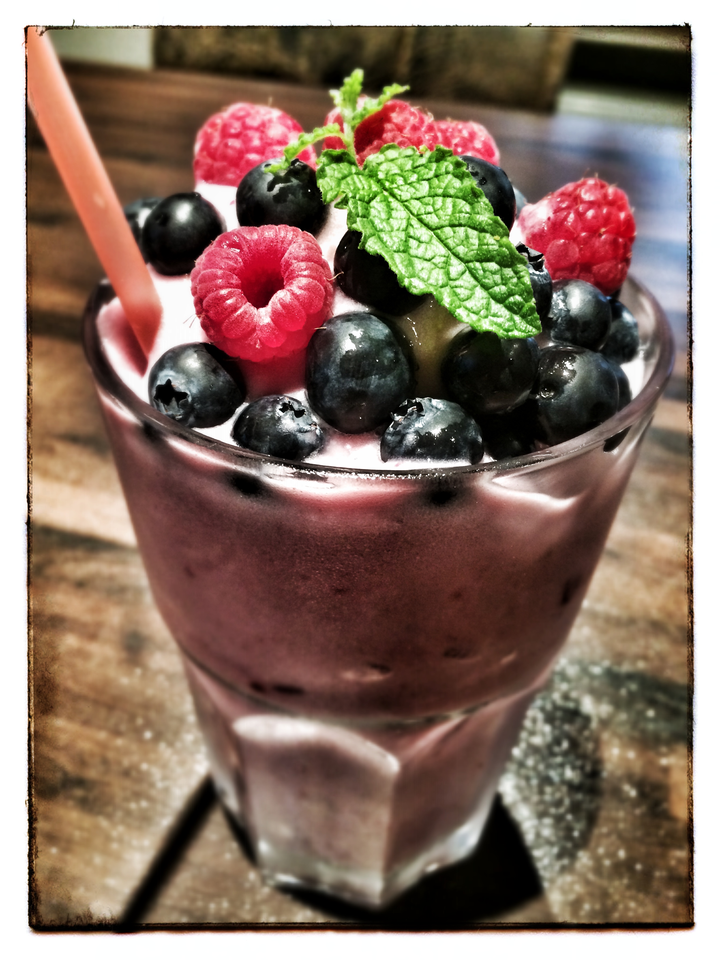 Alles in einer Küchenmaschine (diese sollte Eiswürfel zerkleinern können) zerkleinern, in ein Glas füllen, ein paar frische Beeren oben drauf und mit einem Strohhalm genießen > seeeeeehr lecker 🙂