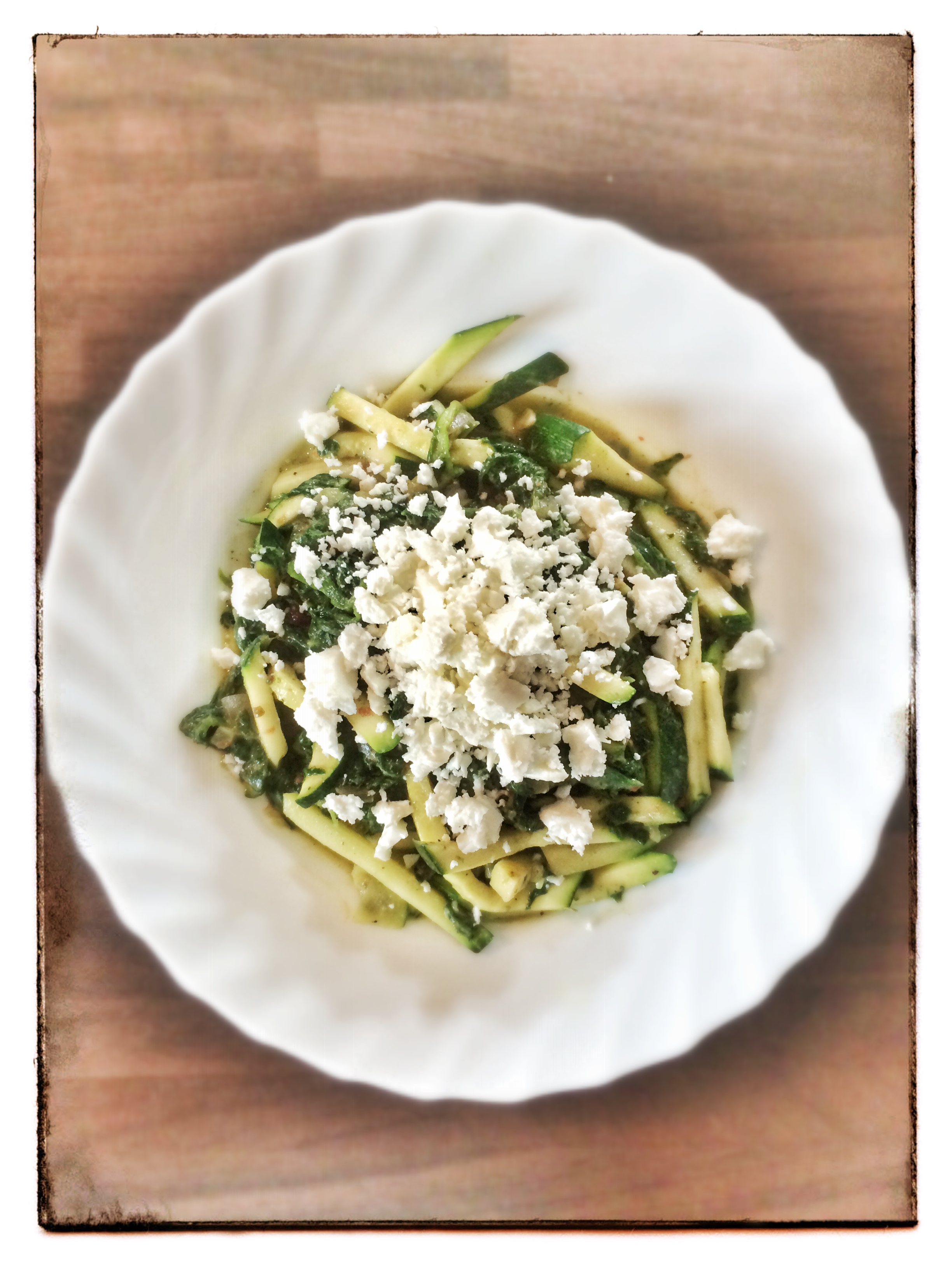 Die Zwiebel klein hacken, mit Kurkuma und Knobi in etwas Olivenöl ca. 2 Min anbraten. Gehackte getrocknete Tomaten und Spinat dazu und weitere 2 Minuten dünsten. Mandelmus mit Wasser verquirlen und mit in die Pfanne geben. Mit Kräutersalz, Pfeffer und evtl. Chili ordentlich würzen!! Die Zucchini mit dem Spiralschneider zu Spaghetti verarbeiten oder mit dem Hobel zu Stiften und in die Pfanne geben. Etwa 3 Minuten in der Spinatpfanne erwärmen. Die Zucchini-Spinat-Nudeln auf dem Teller mit Schafskäse-Topping servieren. SUPER LECKER 🙂 – eines meiner Lieblingsgerichte!