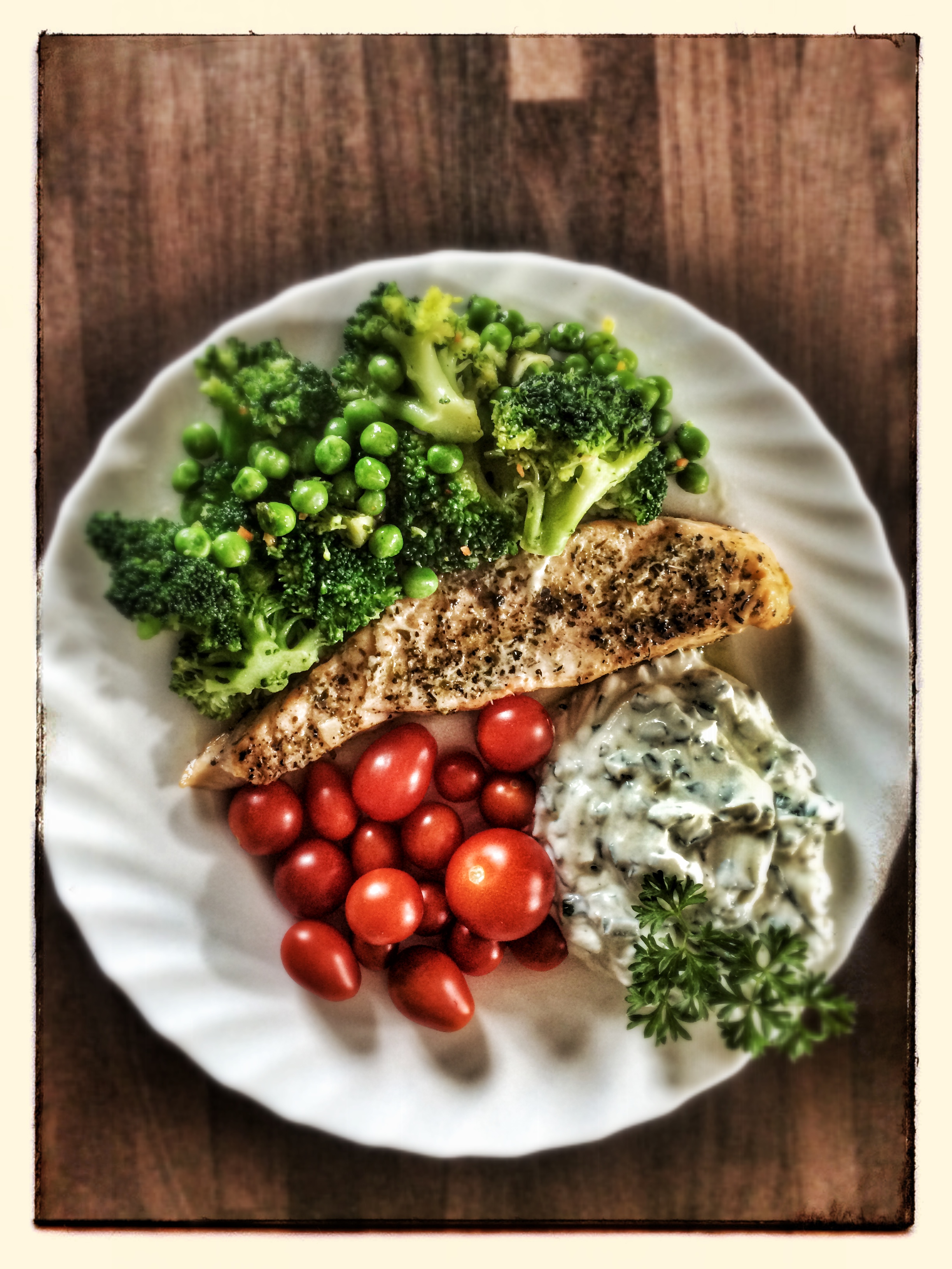 Lachs mit Brokkoli-Erbsengemüse, Cocktailtomaten und Kräuterquark