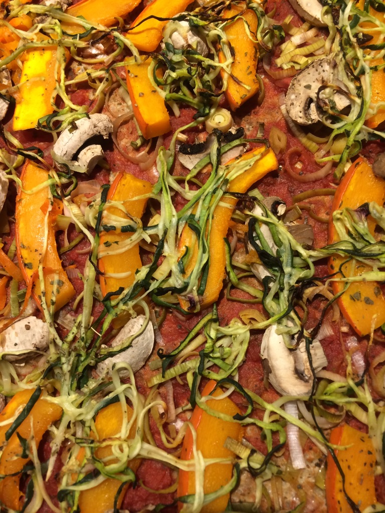 1 Dose Tomatenstücke mit Salz, Pfeffer und Kräutern würzen, auf dem Teig verteilen. Gemüse nach Wahl darauf verteilen und nochmal eine halbe Stunde backen.